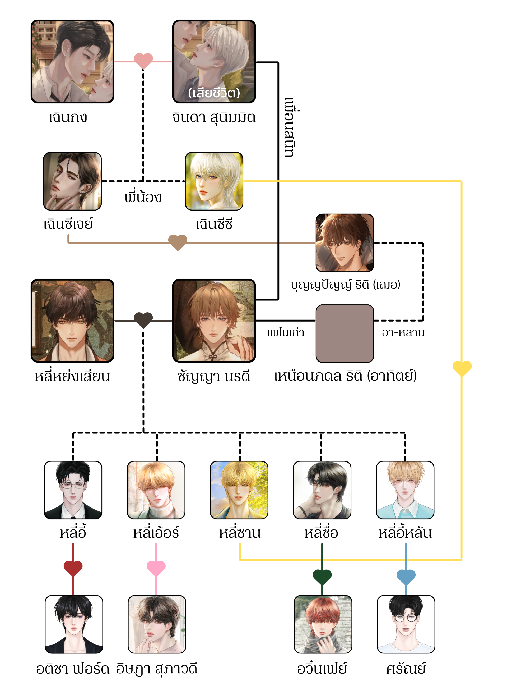 หมายเหตุ : นิยายเวอร์ชันเก่า โทสูง 188 / วา 186 / รัณ 189 / ไอ 177 / อิง 168 / ซีซี 174 / เฟย์ 168 / รัน 169